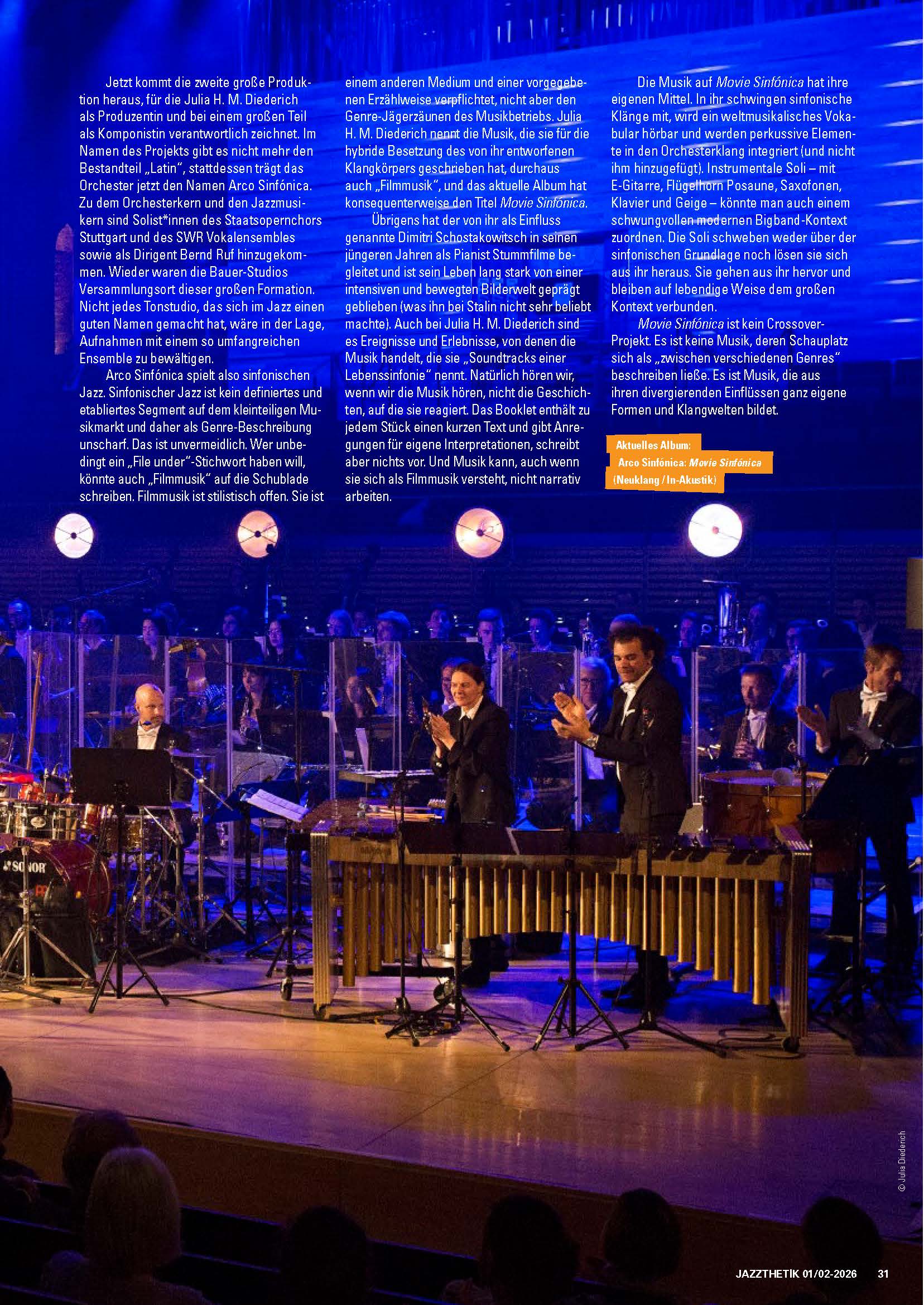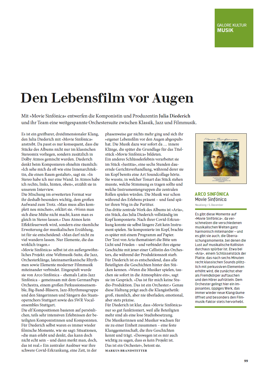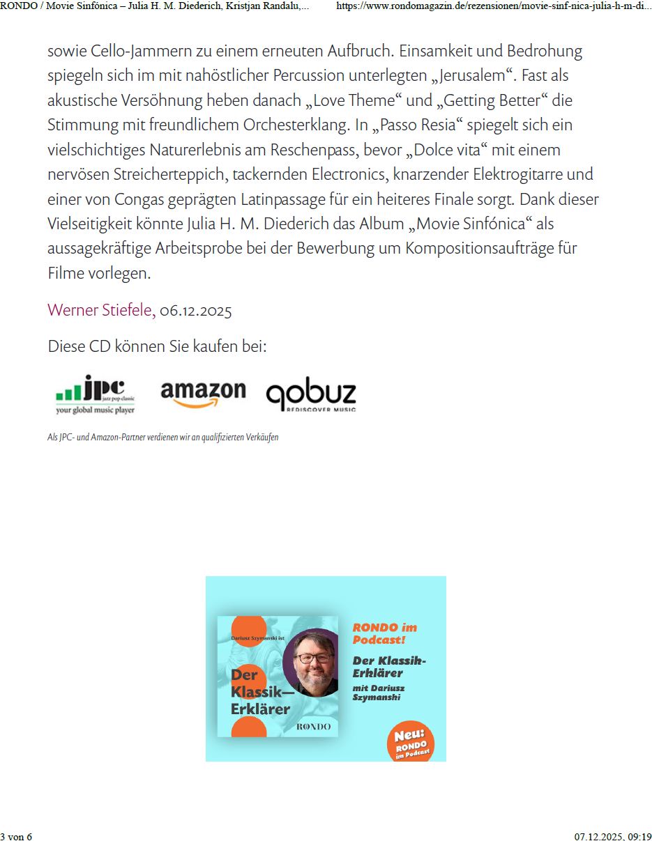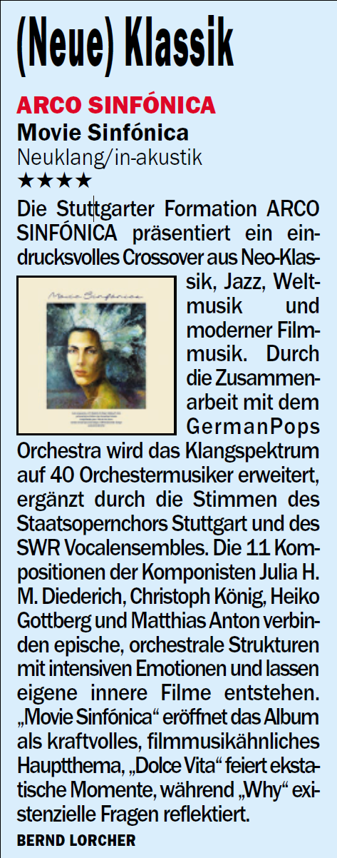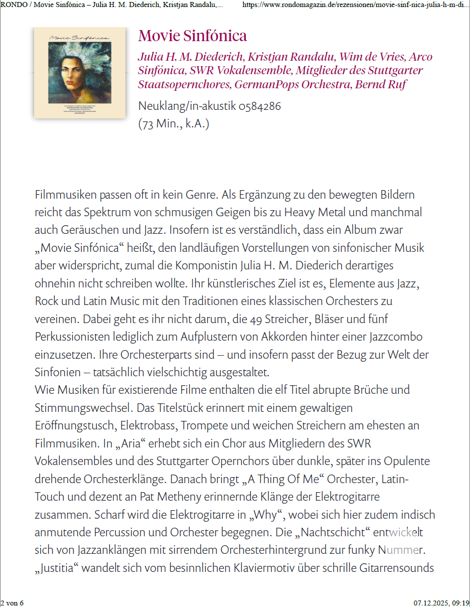 „…Dank dieser Vielseitigkeit könnte Julia H. M. Diederich das Album „Movie Sinfónica“ als aussagekräftige Arbeitsprobe bei der Bewerbung um Kompositionsaufträge für Filme vorlegen.“