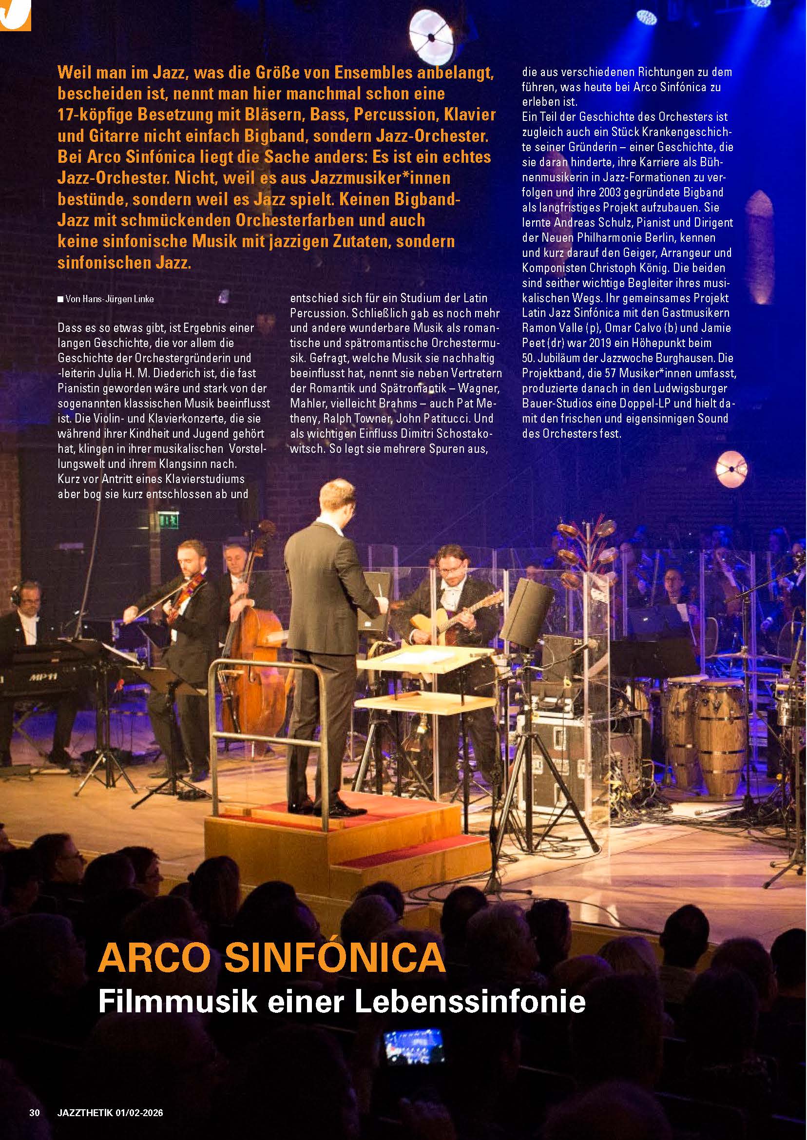 So komplett bis auf den letzten Platz besetzt war die Bühne des Konzerthauses tatsächlich noch nie. Aber „Latin-Jazz Sinfónica!“, ein Sinfonieorchester mit Streichern, Blech- und Holzbläsern plus einer Jazzcombo mit vierfacher Perkussion, Keyboard, Kontrabass, Gitarren und zwei Marimbaphonen braucht eben seinen Raum. Zumal dann, wenn aus akustischen Gründen die Klangbereiche durch transparente Stellwände voneinander getrennt sind. Selbst der Podest des Dirigenten Andreas Schulz war mit Plexiglas abgeschrankt – ein Eindruck zwischen Spiegelkabinett und Aquarium, vor allem wenn die Strahler zum Blau wechselten.