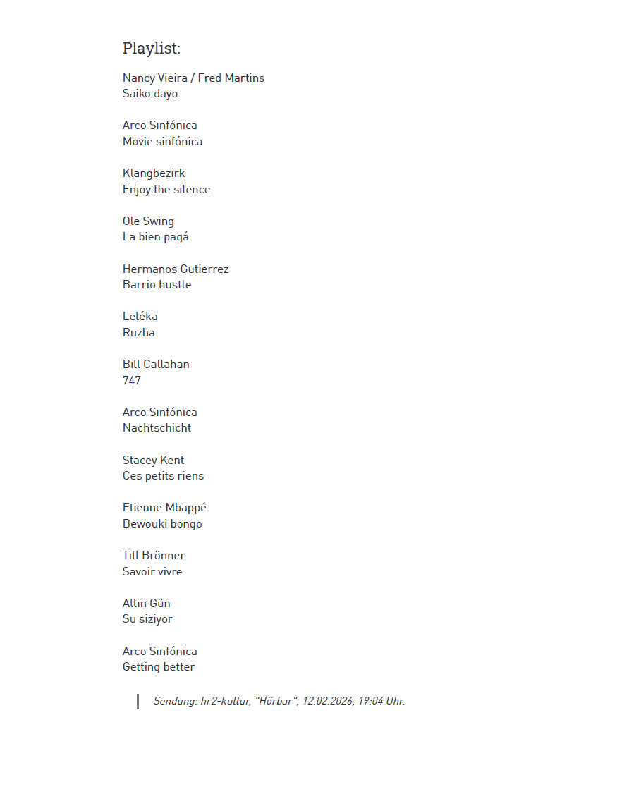 Die Stücke – Jazzstandards von Stan Getz oder dem Kubaner Paquito D’Rivera, von Arturo Sandoval, dem Filmkomponisten Dave Grusin oder dem Gitarristen Pat Metheny – sind zum größten Teil Arrangements des „Special guest“ Christoph König, einem virtuosen Jazzgeiger. Echte Cross-Over-Stücke, die zwischen kubanischen, spanisch-lateinamerikanischen Rhythmen, orientalischem Touch, Big Band, Streichersound und softem Jazz oszillieren – so wie „Friday Morning“, „Cuban Sugar“, „Sonnet for Caesar“ oder „Minuano Six Eight“. Aber auch andere wie Pat Methenys „Heat of the Day“ oder „Little Waltz in 5“ sind atmosphärisch starke Stücke.