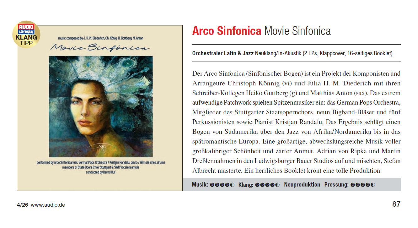 In einer Breitwand-Version entwickelt ARCO SINFÓNICA, begleitet von Bernd Rufs GermanPops Orchestra (und bei der ergreifenden „Aria“ auch vom Chor der Stuttgarter Staatsoper und dem SWR Vocalensemble) auf „Movie Sinfónica“ die Vision einer genreübergreifenden, gleichermaßen in Filmmusik wie Jazz, romantischer Klassik wie weltmusikalischer Rhythmik, energischem Rock wie schwelgerischer Sinfonik beheimateten Musik.