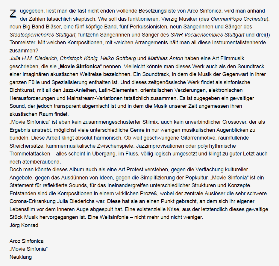 Wann immer wir uns “Movie Sinfónica“ auflegen und anhören, ist die Assoziation zu einem orchestralen Filmsoundtrack durchaus naheliegend. Doch die elf Stücke des Albums, ersonnen von der Komponistin Julia Diederich und den Kollegen Christoph König, Heiko Gottberg nebst Matthias Anton und alsdann eingespielt mit dem GermanPops Orchestra, das durch zusätzliche Instrumentalisten und Chormitglieder verstärkt wurde, sind mitnichten für einen existierenden Film gedacht, sondern lösen nurmehr bildgewaltiges Kopfkino aus. Die „Weltmusik-Suite in 3-D“ mischt Jazz, Klassik und Pop mit Latin-Rhythmen und orientalischen Harmonien crossover-gemäß so lange, bis es in unseren Ohren eindeutig cinematisch klingt. Mission erfüllt!